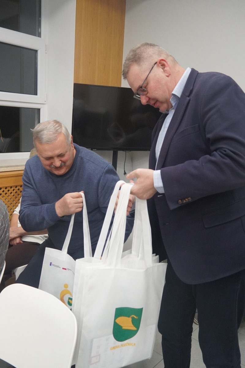 Podczas spotkania każdy z uczestników otrzymał drobny upominek od PCUS - jako wyraz wdzięczności i docenienia za zaangażowanie oraz obecność. Gośćmi spotkania byli Państwo: Dorota Wąż - Przewodnicząca Rady Gminy i Maciej Puchała - Wójt Gminy Płużnica.